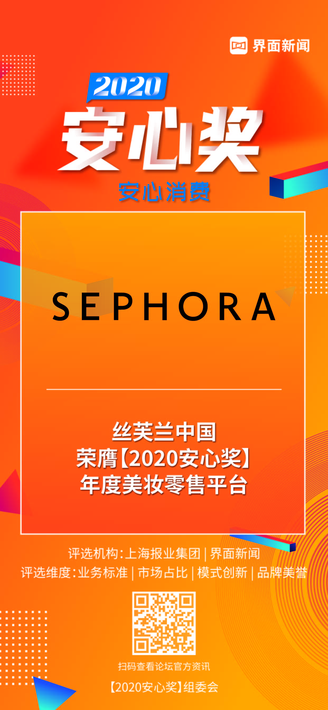 8月27日,上海报业集团l界面新闻在上海鲁能JW万豪侯爵酒店举办了【2020安心奖】颁奖典礼,并正式公布了本年度获奖名单。围绕“安心消费”这一核心价值,来自电商、食品、饮品、美妆、白酒、餐饮等领域优秀企业,夺得了30项年度大奖。丝芙兰中国凭借其打造的全渠道美妆零售体验,荣膺年度美妆零售平台大奖。