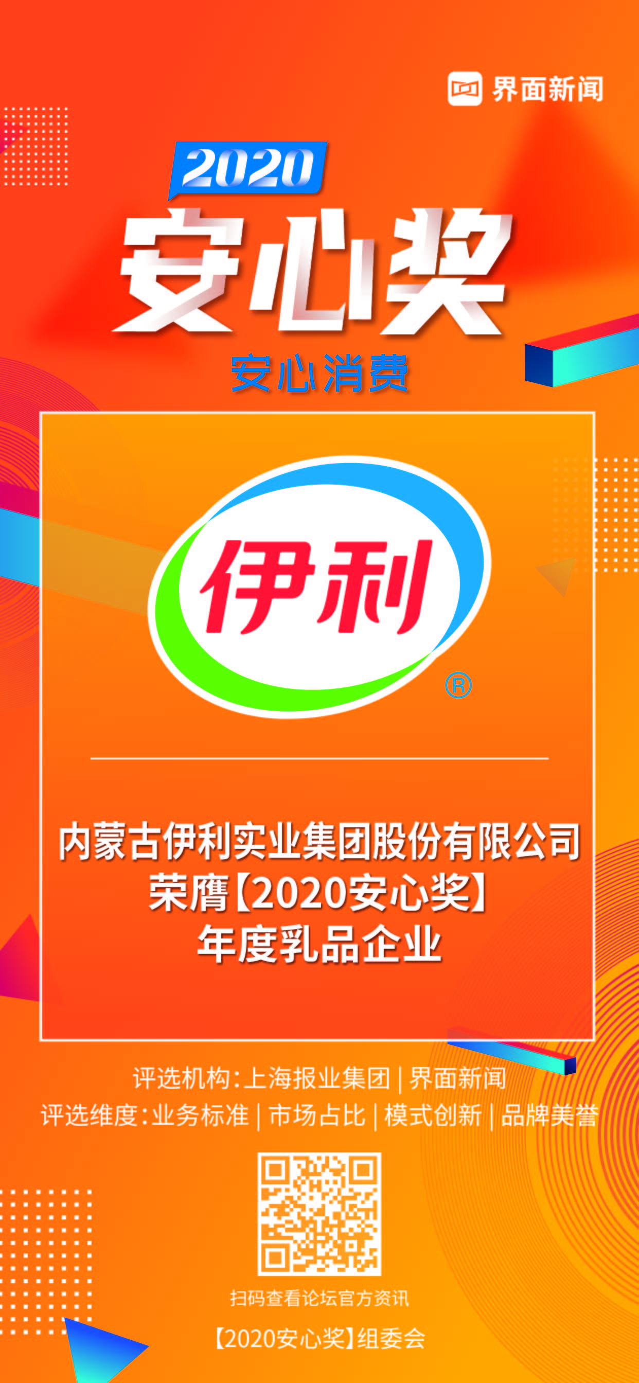 8月27日,上海报业集团l界面新闻在上海鲁能JW万豪侯爵酒店举办了【2020安心奖】颁奖典礼,并正式公布了本年度获奖名单。围绕“安心消费”这一核心价值,来自电商、食品、饮品、美妆、白酒、餐饮等领域优秀企业,夺得了30项年度大奖。内蒙古伊利实业集团股份有限公司凭借一如既往的品质把控和值得信赖的服务,荣膺年度乳品企业大奖。
