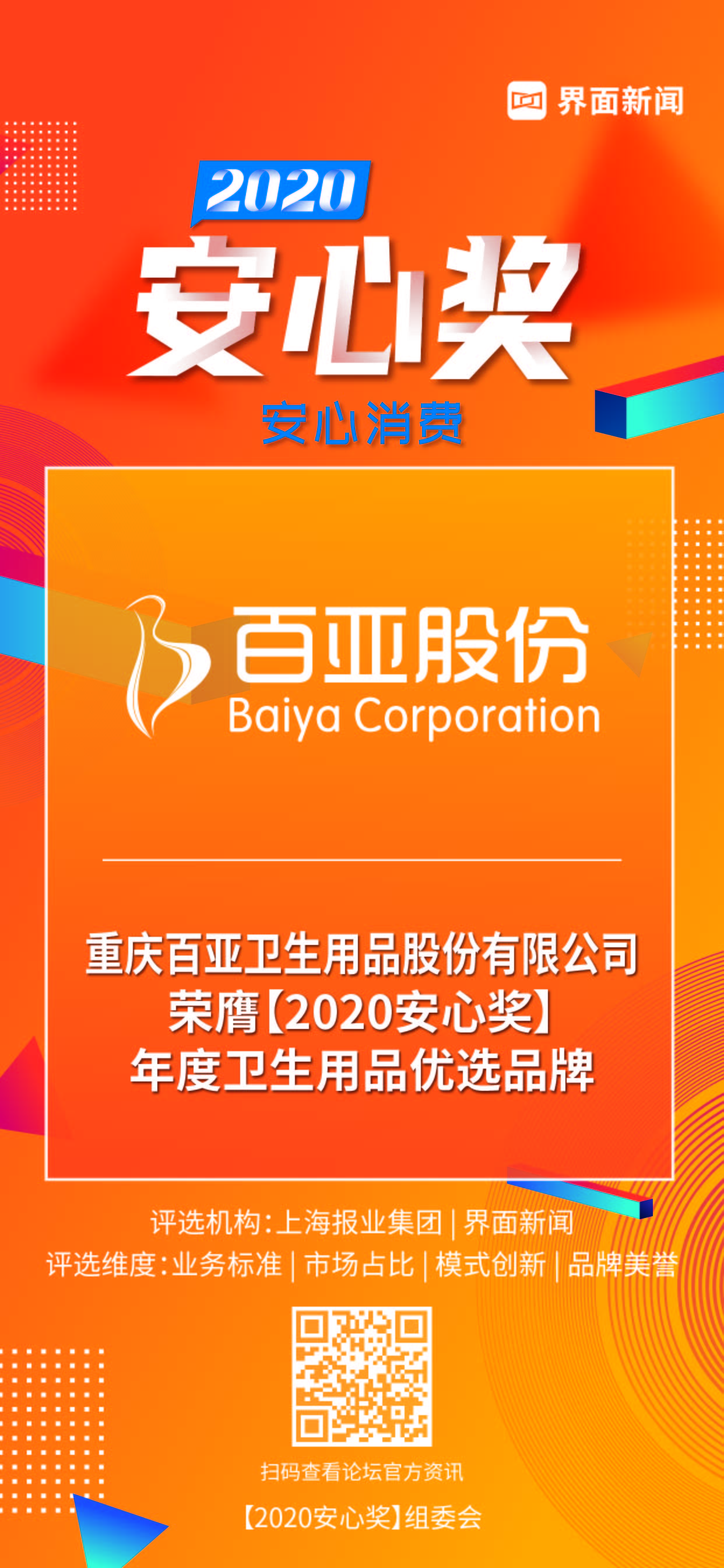 8月27日,上海报业集团l界面新闻在上海鲁能JW万豪侯爵酒店举办了【2020安心奖】颁奖典礼,并正式公布了本年度获奖名单。围绕“安心消费”这一核心价值,来自电商、食品、饮品、美妆、白酒、餐饮等领域优秀企业,夺得了30项年度大奖。重庆百亚卫生用品股份有限公司以其精益求精的品质追求和品牌魅力,荣膺年度卫生用品优选品牌大奖。