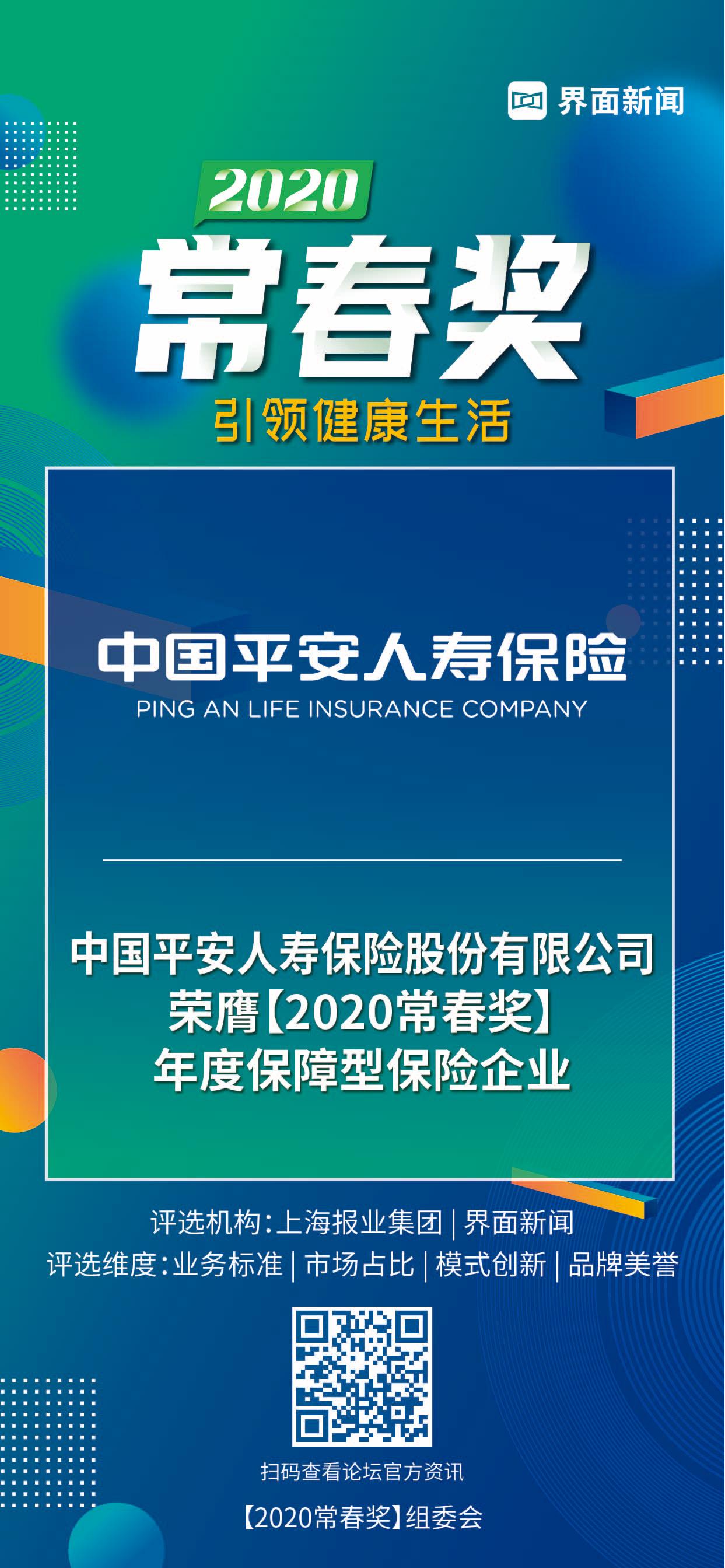 8月27日,上海报业集团l界面新闻在上海鲁能JW万豪侯爵酒店举办了【2020常春奖】颁奖典礼,并正式公布了本年度获奖名单。围绕“引领健康生活”这一核心宗旨,来自于医疗保险、医疗科技、医药零售、健康检测、实践创新等领域优秀企业,夺得了20项年度大奖。中国平安人寿保险股份有限公司凭借其有保障的服务,荣膺年度保障型保险企业大奖。