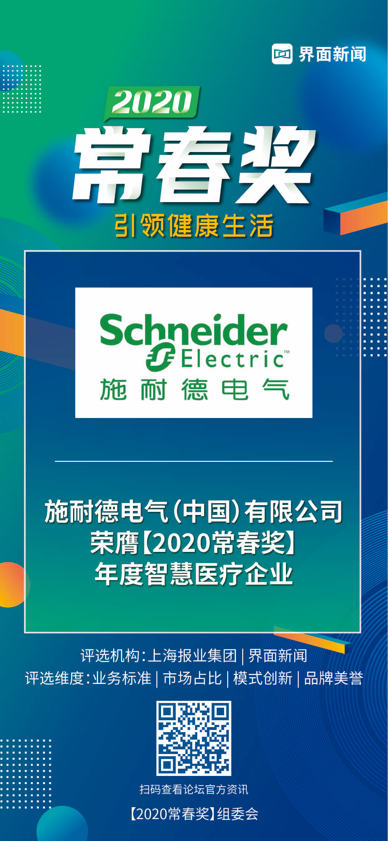 8月27日,上海报业集团l界面新闻在上海鲁能JW万豪侯爵酒店举办了【2020常春奖】颁奖典礼,并正式公布了本年度获奖名单。围绕“引领健康生活”这一核心宗旨,来自于医疗保险、医疗科技、医药零售、健康检测、实践创新等领域优秀企业,夺得了20项年度大奖。施耐德电气(中国)有限公司以其升级换代的医疗技术,荣膺年度智慧医疗企业大奖。