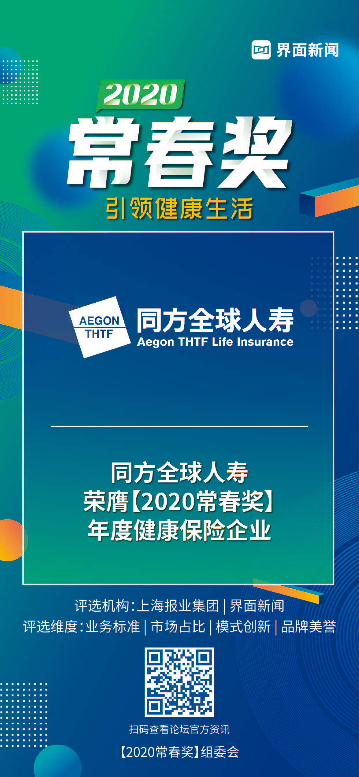 8月27日,上海报业集团l界面新闻在上海鲁能JW万豪侯爵酒店举办了【2020常春奖】颁奖典礼,并正式公布了本年度获奖名单。围绕“引领健康生活”这一核心宗旨,来自于医疗保险、医疗科技、医药零售、健康检测、实践创新等领域优秀企业,夺得了20项年度大奖。同方全球人寿凭借其打造的健康管理服务,荣膺年度健康保险企业大奖。