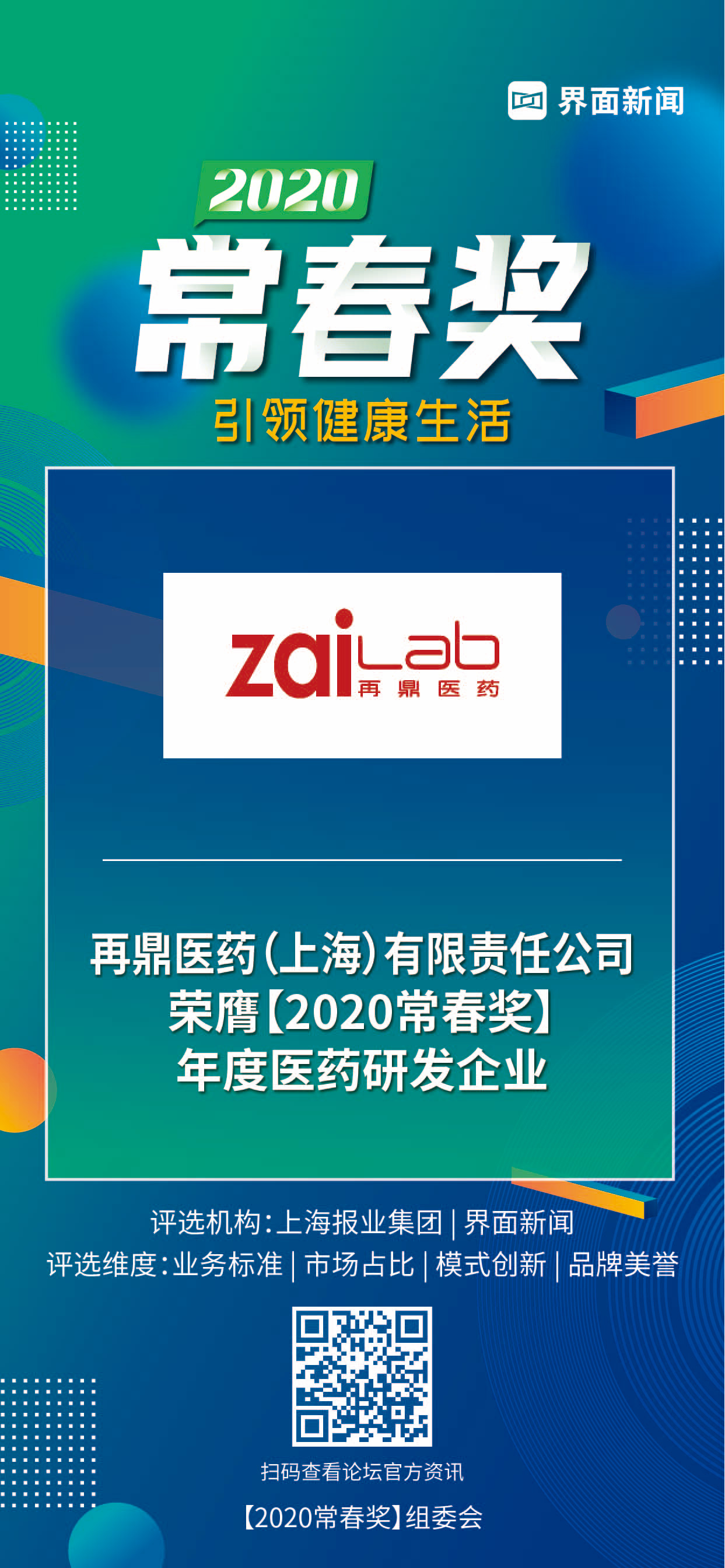 8月27日,上海报业集团l界面新闻在上海鲁能JW万豪侯爵酒店举办了【2020常春奖】颁奖典礼,并正式公布了本年度获奖名单。围绕“引领健康生活”这一核心宗旨,来自于医疗保险、医疗科技、医药零售、健康检测、实践创新等领域优秀企业,夺得了20项年度大奖。再鼎医药(上海)有限责任公司以其充满竞争优势的研发能力,荣膺年度医药研发企业大奖。