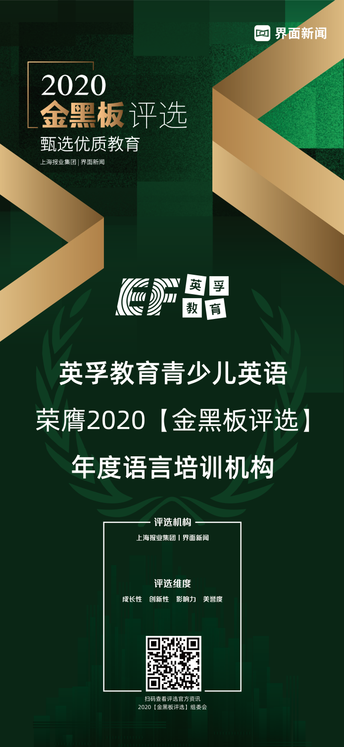 12月23日,上海报业集团l界面新闻揭晓 2020【金黑板评选】终榜,正式公布了本年度获奖名单。聚焦教育行业的升级和变化,来自于教育行业的优秀企业,夺得了30项年度大奖。英孚教育青少儿英语凭借其优质教学以及良好口碑,荣膺年度语言培训机构。