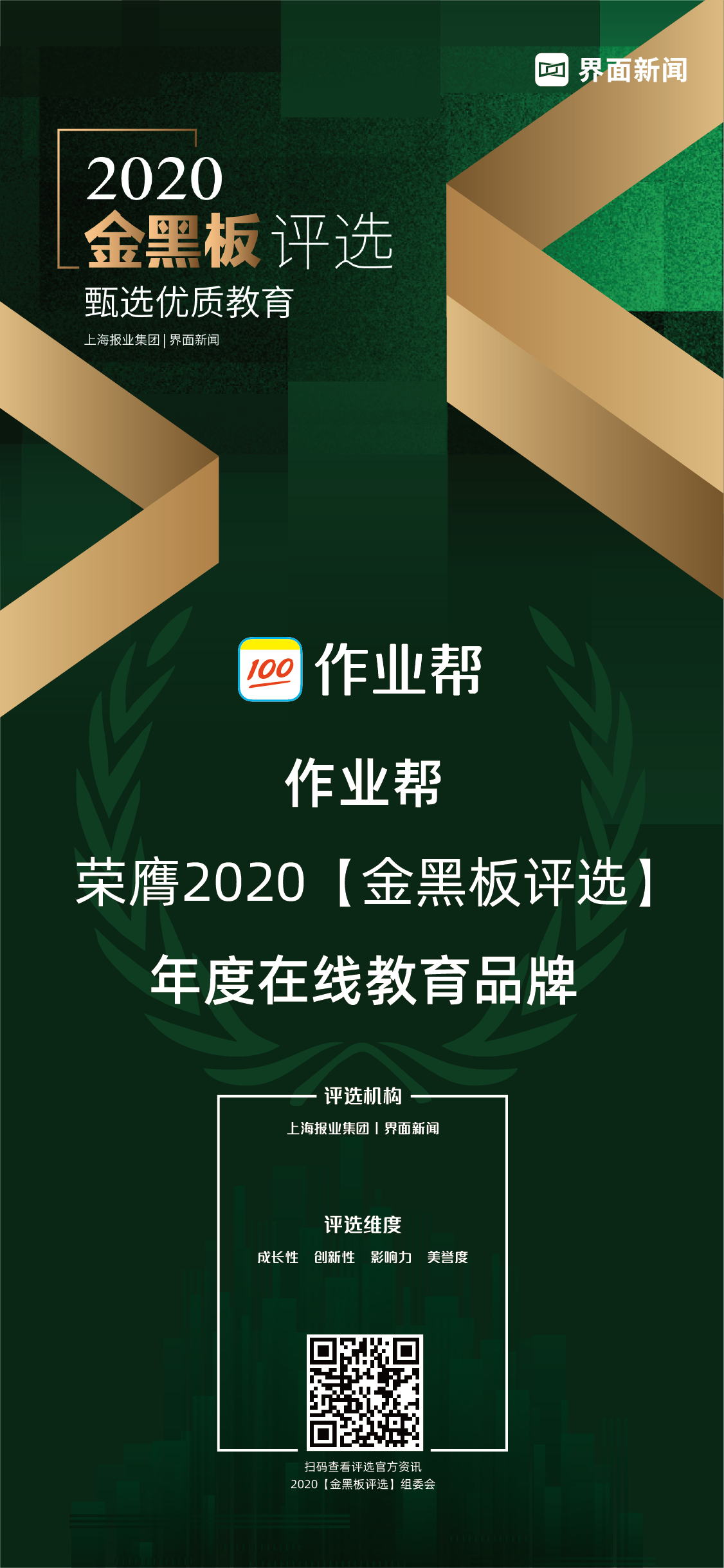 12月23日,上海报业集团l界面新闻揭晓2020【金黑板评选】终榜,正式公布了本年度获奖名单。聚焦教育行业的升级和变化,来自于教育行业的优秀企业,夺得了30项年度大奖。作业帮凭借其优质的服务和强大的市场影响力,荣膺年度在线教育品牌。