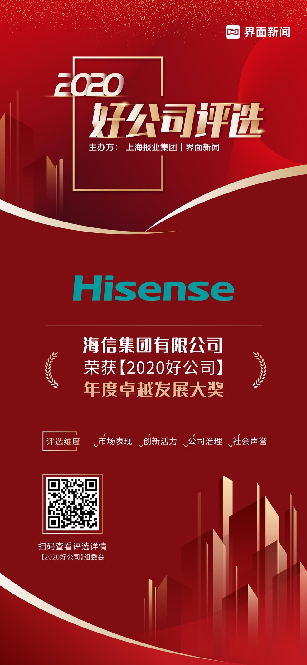 12月23日,上海报业集团l界面新闻在在上海静安瑞吉酒店举办了【2020好公司】颁奖典礼,并正式公布了本年度获奖名单。来自36个细分行业440逾家候选公司,经大众投票统计、市场表现、创新能力、治理体系和社会声誉等方面的角逐,最终54家优质企业突出重围荣登年度荣誉榜单。海信集团凭借整体性规划、战略型布局,形成独特的产业风格,荣膺荣膺【2020好公司——卓越发展大奖】。