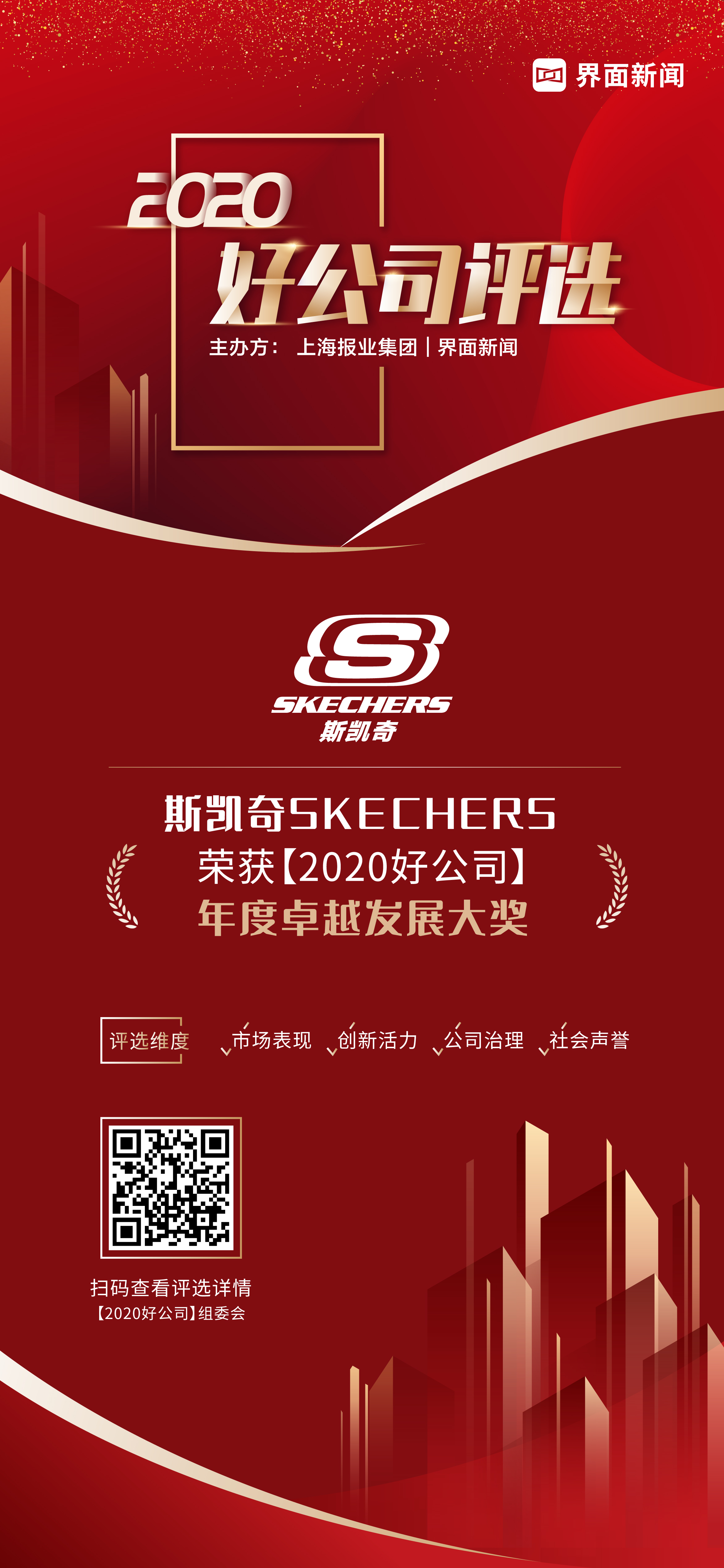 12月23日,上海报业集团l界面新闻在在上海静安瑞吉酒店举办了【2020好公司】颁奖典礼,并正式公布了本年度获奖名单。来自36个细分行业440逾家候选公司,经大众投票统计、市场表现、创新能力、治理体系和社会声誉等方面的角逐,最终54家优质企业突出重围荣登年度荣誉榜单。斯凯奇SKECHERS始终坚持提供“舒适、乐趣、有型”的运动休闲装备,为人类生活更美好做出贡献,因而荣膺【2020好公司——卓越发展大奖】。