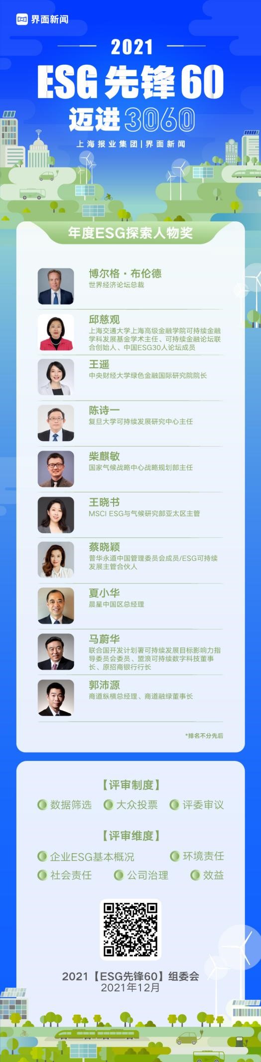在“3060”双碳目标和可持续高质量发展的背景下,ESG概念在2021年被广泛认知,参与机构、企业不断增加,风云人物汇集,使今年成为ESG元年。而这与ESG领域的众多领导者的倡导、钻研、推动密不可分。