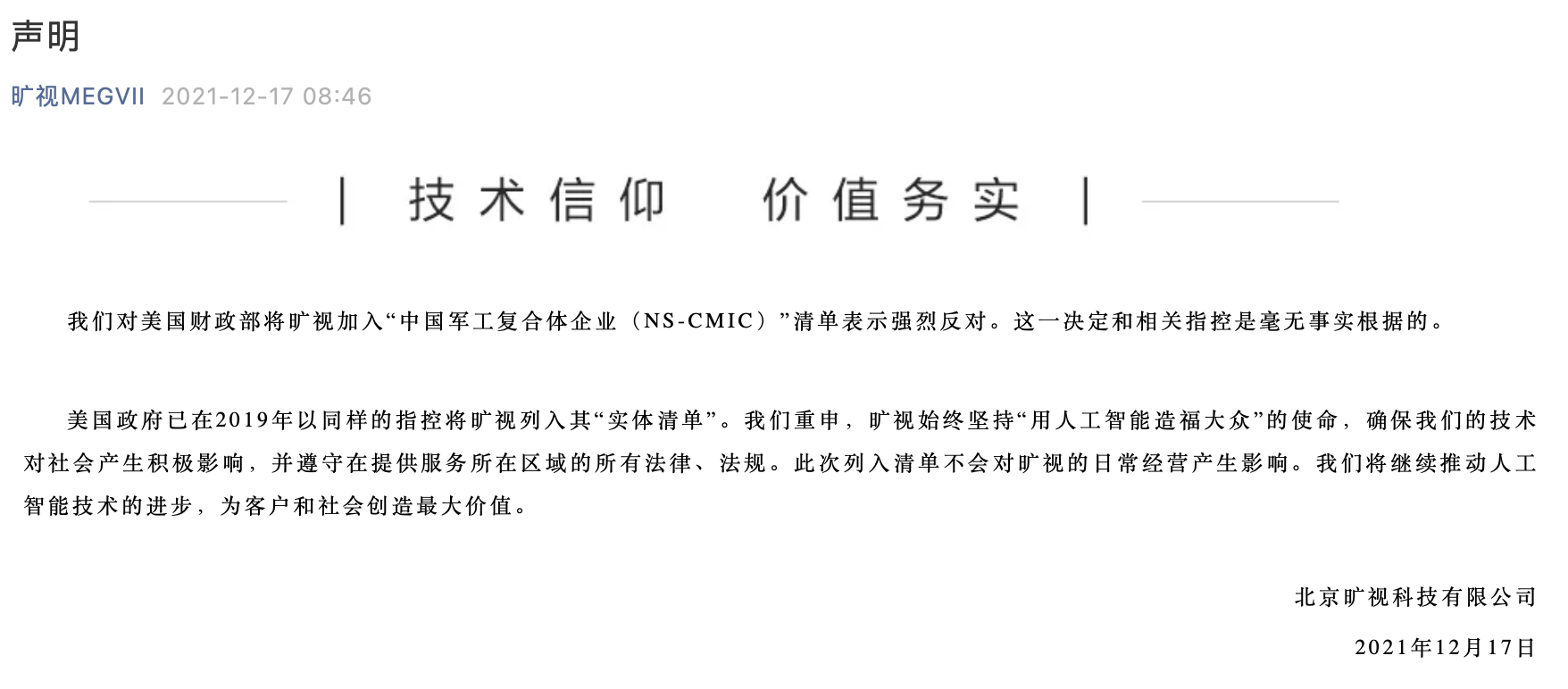 12月17日,旷视科技发布声明称,对美国财政部将旷视加入“中国军工复合体企业(NS-CMIC)”清单表示强烈反对。公司称,这一决定和相关指控是毫无事实根据的。