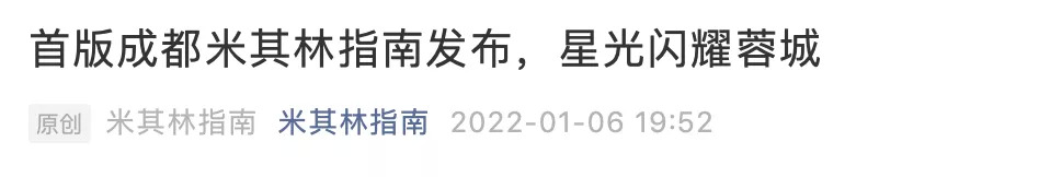 1月6日,米其林正式发布了首版(2022年)成都米其林指南完整榜单,包括1家二星餐厅,8家一星餐厅和13家必比登推介餐厅,以及特别奖项——米其林服务奖。