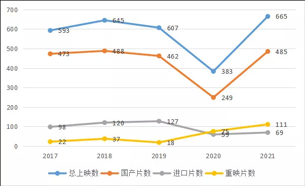 图1:2017-2021年中国电影市场上映影片数量(单位:部)(数据来源:猫眼专业版)