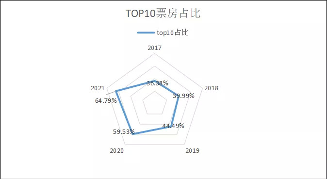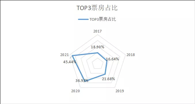 头部更集中,甚至赢家通吃。无论是前三部,还是前十部的票房占比都创出新高,Top10的总票房达到306.18亿,首次超过了300亿。但《长津湖》《你好,李焕英》《唐人街探案3》三部电影就分割了214.75亿,在全年票房的占比更是接近50%,是市场蛋糕最大的分割者。剩下的655部电影只贡献了166.4亿票房,平均票房2540万,“贫富”差距进一步拉大。
