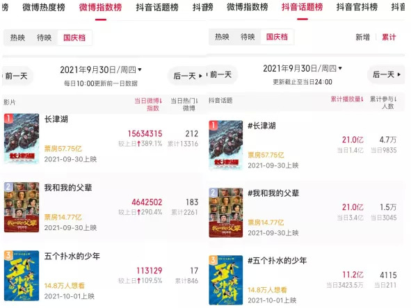 图10:2021年9月30日的国庆档微博指数榜、抖音话题榜 (来源:猫眼专业版)