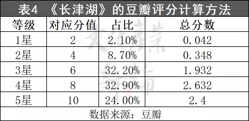 关键就在于获得真实口碑是很难获得的。口碑的主要表现形式——互联网评分,计算方法是存在局限的。目前的主要评分网站有猫眼、淘票票、豆瓣和时光网,其中,观众更认可豆瓣评分。它是把构成比加总的结果。以《长津湖》为例,如表4,将各个区间的总分数相加,就可以得到7.4的评分。