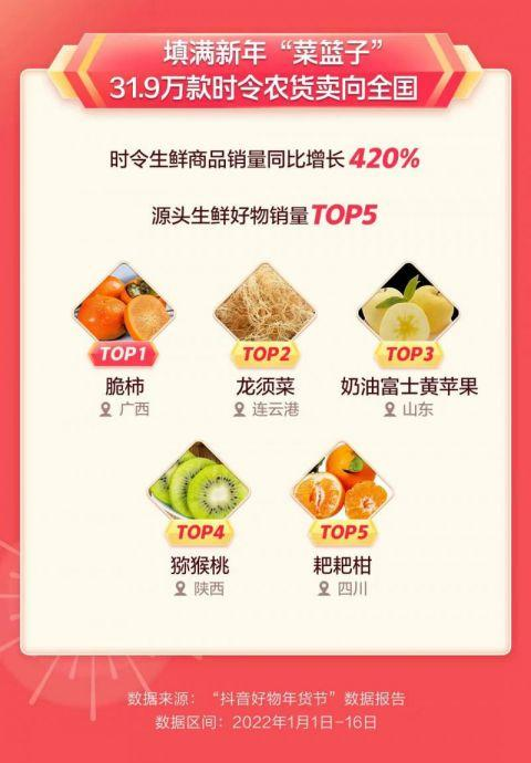 抖音则抖音围绕“国潮出新,年味到家”的主题,推出了“壬寅迎新”“匠心年味”“国货好礼”“源头特产”四个版块,同时还特设了“家乡年货节”专场。其相关数据显示,在年货节期间,抖音电商上线了31.9万款时令农货,生鲜类农特产销量同比增长420%。