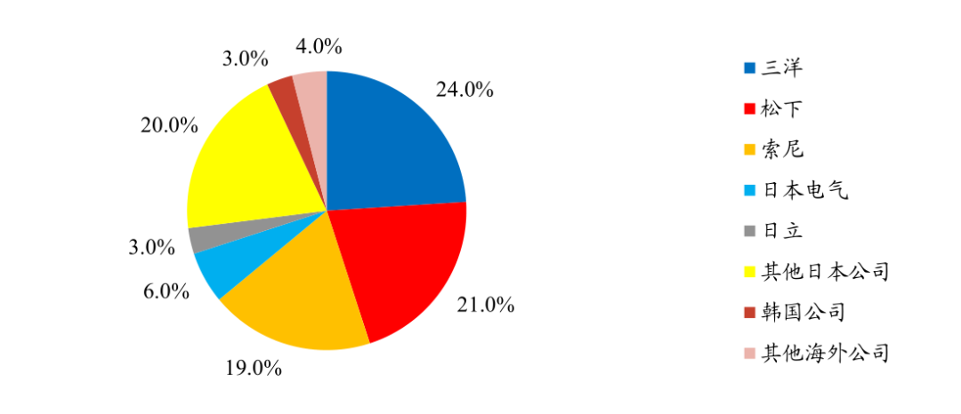 在2000年以前,日本企业凭借专利优势与先发优势几乎垄断全球锂离子电池市场,也造就了三洋、松下等锂电池巨头。可以看到2000年的数据,三洋、松下、索尼三家企业分别占有全球市场的24%、21%和19%,排名前三。