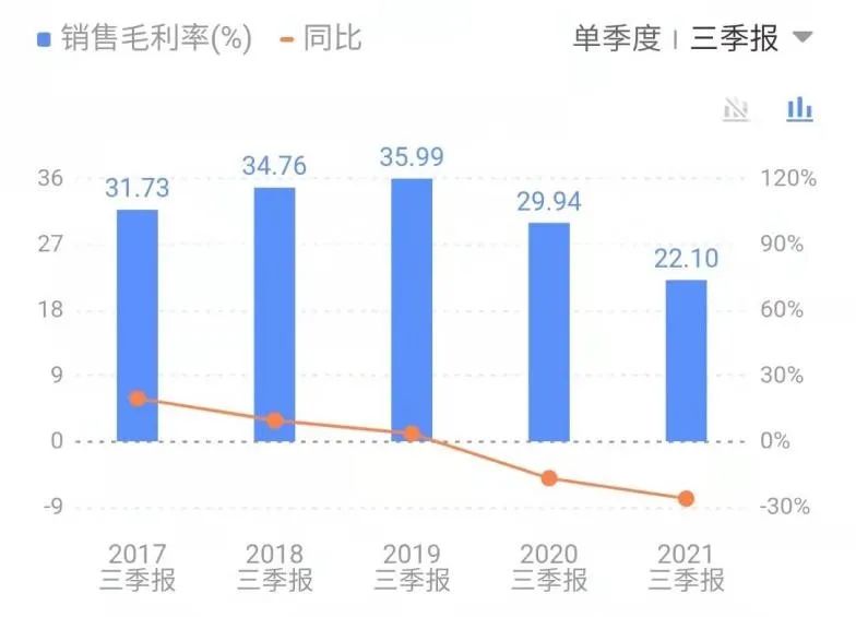 据万科2021年第三季度财报显示,净利润为166.89亿元,同比下滑15.98%;经营活动现金流为12.2亿元,同比减少96.35%;毛利率为22.1%,同比减少7.84个百分点。