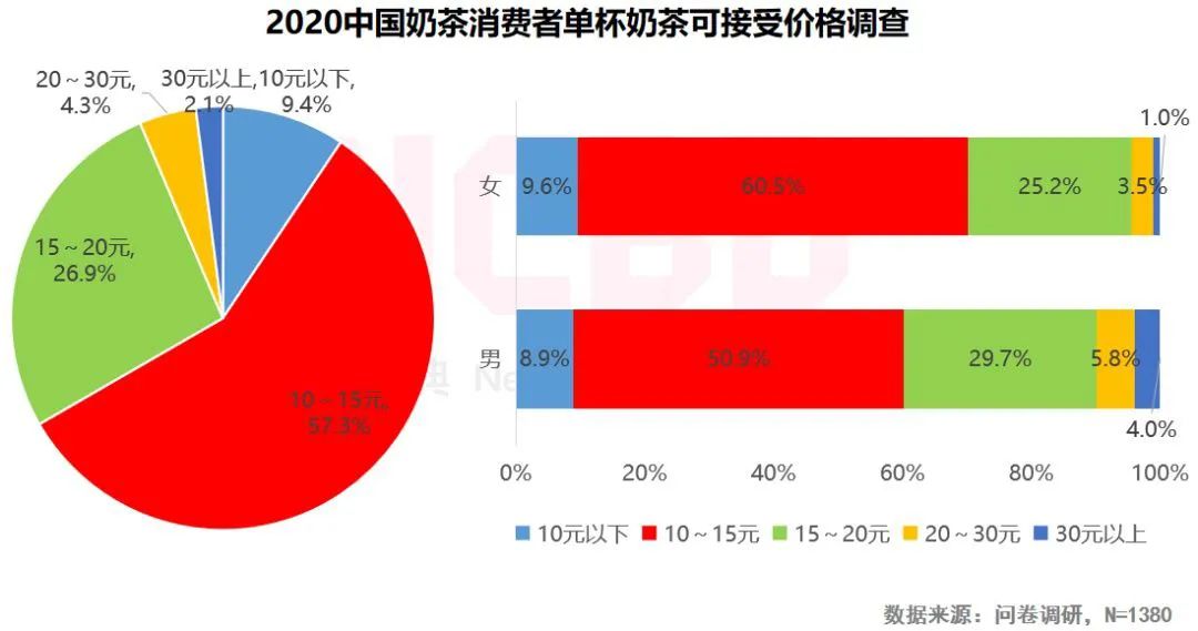 NCBD(餐宝典)发布的《2020-2021 中式新茶饮行业发展报告》数据也表明,消费10-15元单杯奶茶的消费者占比为57%,其次是占比27%的15-20元区间。这意味着,10-20元的中端奶茶市场占比高达84%,这个区间也拥有最多的茶饮品牌。