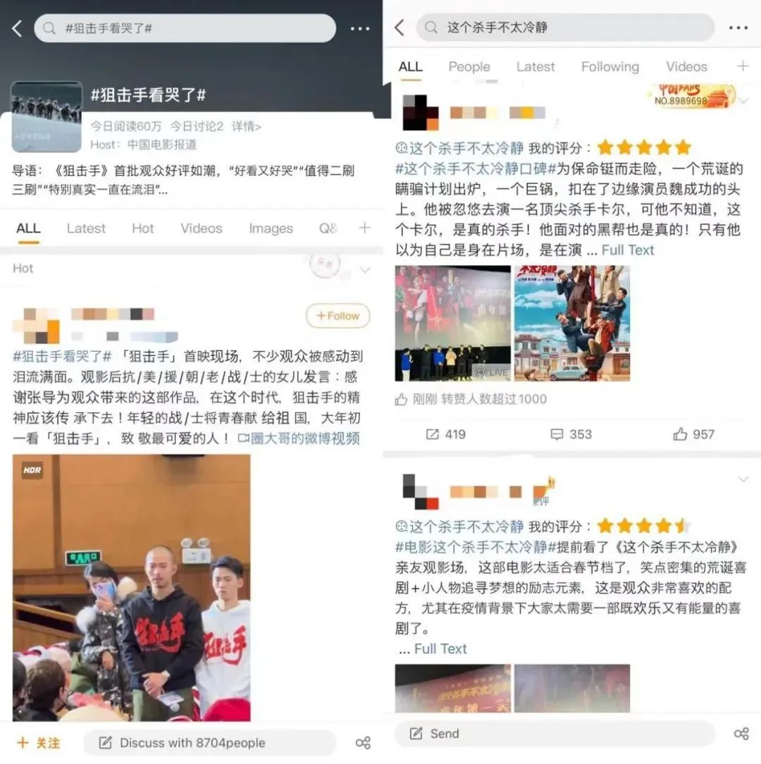 近年来,随着影片营销的需求更加多样化,微博也出现了多元的营销玩法。例如在今年春节档的《四海》《这个杀手不太冷静》两部影片协同微博展开的独家直播、主创扫楼等直播类营销,还有《狙击手》和去年贺岁档上映的《雄狮少年》协同官媒、大V在微博展开的图文类口碑营销等。