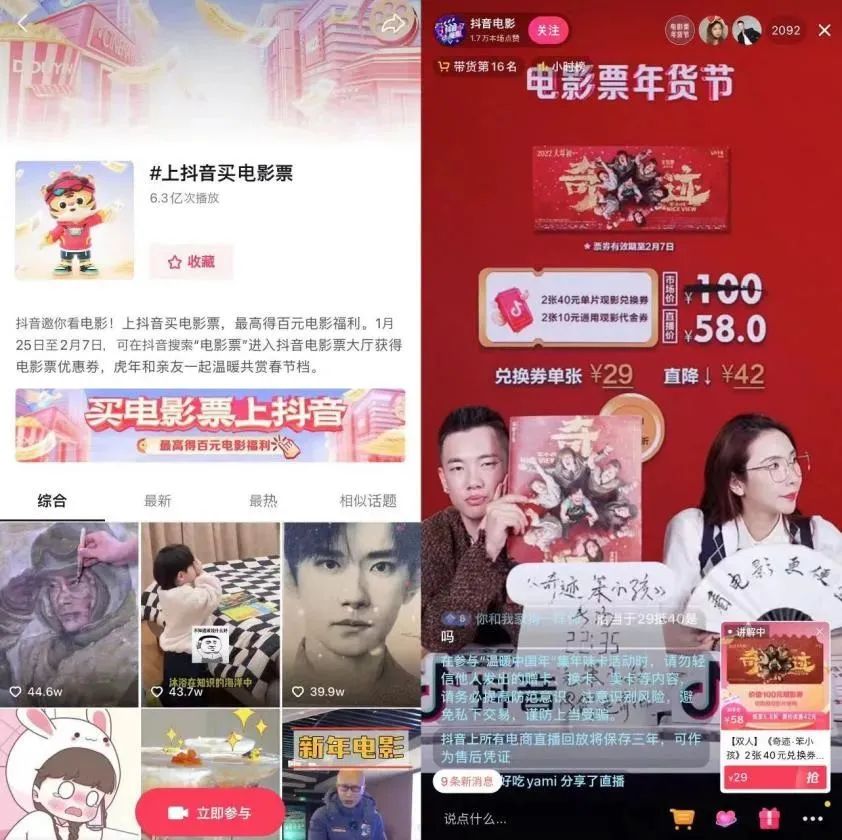 今年春节档前,在字节跳动收购在线票务平台影托邦后,抖音迅速联合展开相关动作,通过销售优惠电影票等手段进一步为平台电影生态赋能。