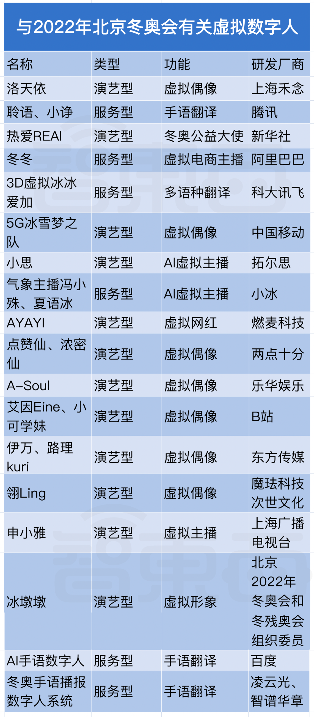 除了这类身份型虚拟数字人,功能型虚拟数字人同样受到不少厂商的欢迎。腾讯、小冰、百度纷纷带着自己的虚拟数字人在冬奥会上“露一手”,手语翻译、电商带货、天气播报等各种类型的虚拟数字人开始“卷”起来了。