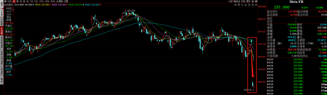 财报及“元宇宙计划”亏损实情曝光后,市场出现大规模抛售,Meta周四股价狂泻26.44%,市值单日缩水2513亿美元,久违的来到了6000亿美元线下。
