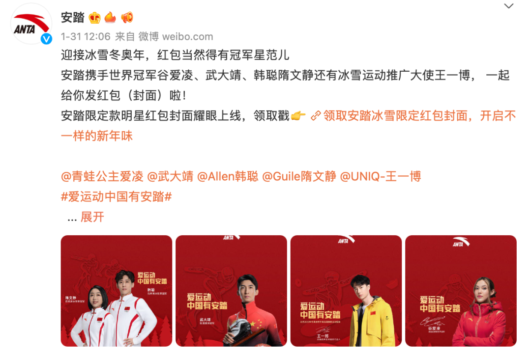 在延续动漫视频风格的基础上,安踏还推出了一支冬奥剪纸创意短片。视频中,纸人“运动员”正在参与越野滑雪、短道速滑、冰壶、花样滑冰等冬奥比赛项目,创意十足地展现了中国传统文化的博大精深。喜庆中国红色彩的妙用,进一步辉映了民族品牌安踏的崛起,深度激发人们内心的情感共鸣。读来朗朗上口的“冬奥15赛项12支中国队穿安踏”,试图以中国队的选择,引领大众的选择。借助这一串数字自带的韵律感,该话题迅速在微博引发热议,增强了人们对安踏品牌的记忆和信服感。
