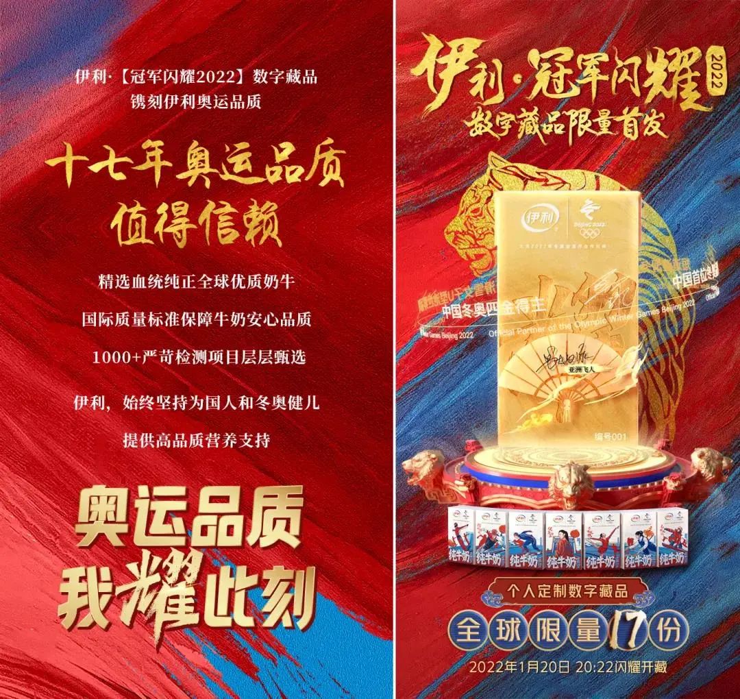 除了上线冬奥主题动画和冬奥主题包装产品,伊利此次还将文化破圈、颜值破圈玩到了新高度。其推出“冠军闪耀2022”数字藏品,一方面彰显了大气国潮风范,另一方面也使人们看到了一个更具“文化自信”和“民族自信”的伊利。线上,伊利在官方商城开展“扫码赢好礼,我耀冬奥年”小程序抽奖活动,通过线下扫码,线上互动的形式,打破私域流量的宣传壁垒,促进线上线下的火爆宣传。与此同时,伊利还在沈阳、上海、哈尔滨、南京等地,搭建冬奥主题展台,开展机器人热牛奶、机器人烘焙、美食DIY等线下活动,进一步达成伊利品牌与用户间的同频联结,促使人们自发近距离感受伊利产品健康、营养、美味等卖点特性。