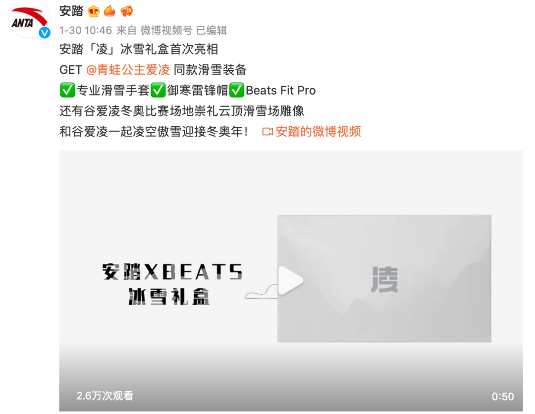 除却视频之外,安踏还精心准备了一些好玩的“冬奥主题周边”。比如,上线冬奥新春红包封面,在新春的仪式感互动中,充分调动了人们的积极性,促使人们自发开展对安踏的二次线上宣传。再比如,推出冰墩墩同款主题冬奥帽,以及与Beats联合打造冰雪礼盒,从中可见品牌对热点事件的关注,以及不走寻常路的花样营销思路。借助热点事件和创意玩法的表达,安踏紧随时代的科技潮流属性,及其时尚典雅的品牌形象也得以被公众捕捉和熟知,品牌的时尚价值与内涵底蕴也随之得到进一步升华。