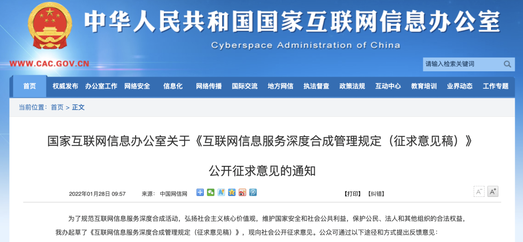▲《互联网信息服务深度合成管理规定(征求意见稿)》