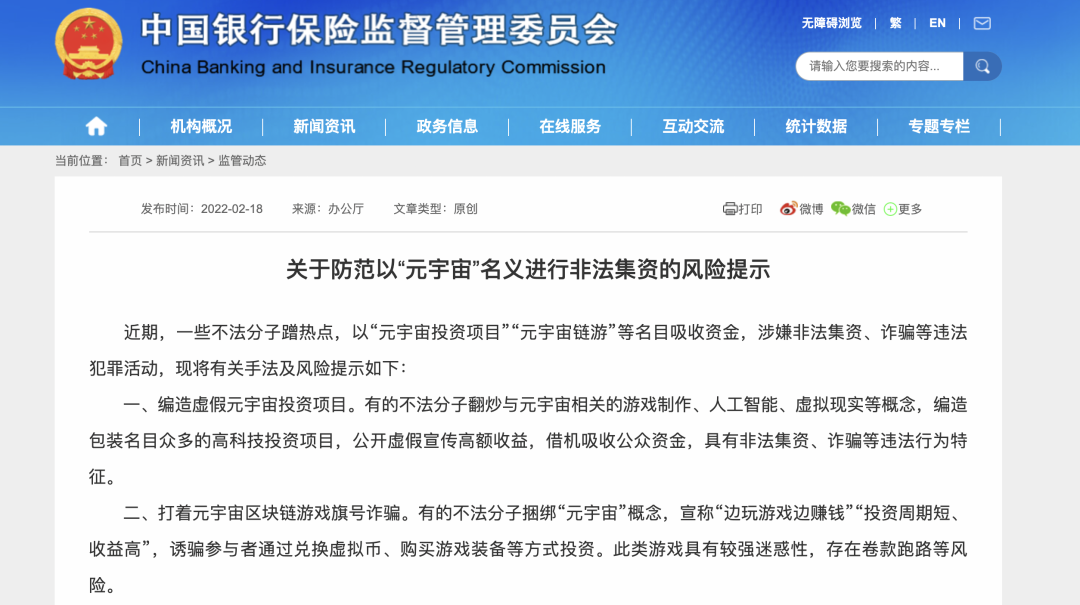 2月18日,中国银保监会发布了《关于防范以“元宇宙”名义进行非法集资的风险提示》,并给出了四种常见的犯罪手法。