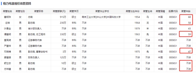 其中,庄培、谭建明、方祥建是三位元老,2002年、1989年、2004年加入格力,庄培、谭建明两人年龄都将近60岁,方祥建年龄不详。邓晓博和舒立志都是新人,分别在2020年11月、2019年12月加入格力,邓晓博47岁,舒立志年龄不详。