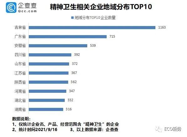 根据统计,我国抑郁症患病率为2.1%,焦虑障碍患病率已达到4.98%,有16%-17%的人深受各种各样精神心理问题的困扰。根据企查查数据显示,目前我国现存“精神卫生”相关企业总共只有七八千家,在地域上现存精神卫生相关企业主要分布在吉林、广东、安徽等省份,其他省份加起来只有百十家左右,而注册资本在100万元以下的中小企业占了60%。