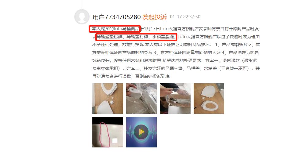 一位消费者近日投诉称,自己在TOTO天猫官方旗舰店购买的TOTO马桶由安装师傅亲自打开时发现马桶坐垫粉碎、马桶盖粉碎、水箱盖裂缝等产品质量问题,消费者称留存有产品碎裂照片、官方安装师傅录音等。但TOTO官方旗舰店却以过了快递时效为由不予任何处理。