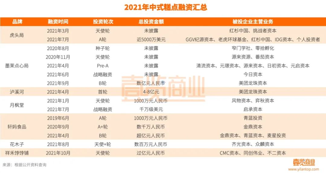 壹览商业数据显示,2021年中式糕点领域共发生10起融资,涉及6个品牌,披露融资金额超10亿元,投资方不乏红杉中国、IDG资本、美团龙珠、今日资本、GGV等顶级机构。