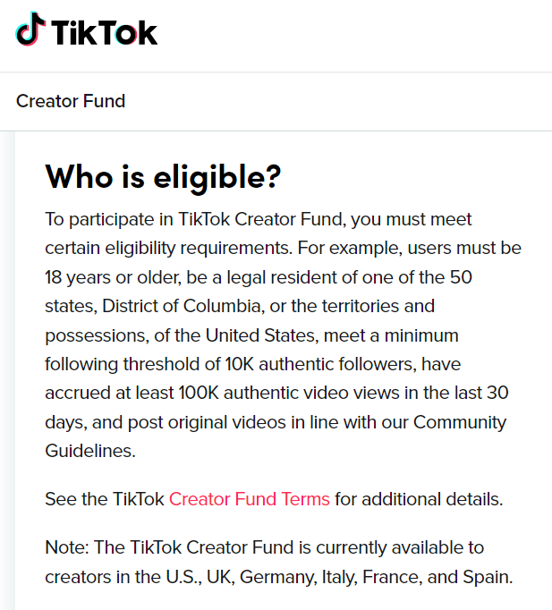 目前,TikTok创作者基金还未面向全球开放,仅对美、英、法、德、西班牙及意大利几国年满18岁的用户开放申请。除了地域方面的限制,想要拿到这笔基金,账号的粉丝规模也需达到一定的资格门槛。例如,粉丝数需达到1万名以上,且过去30天内的视频播放量需至少达到10万。