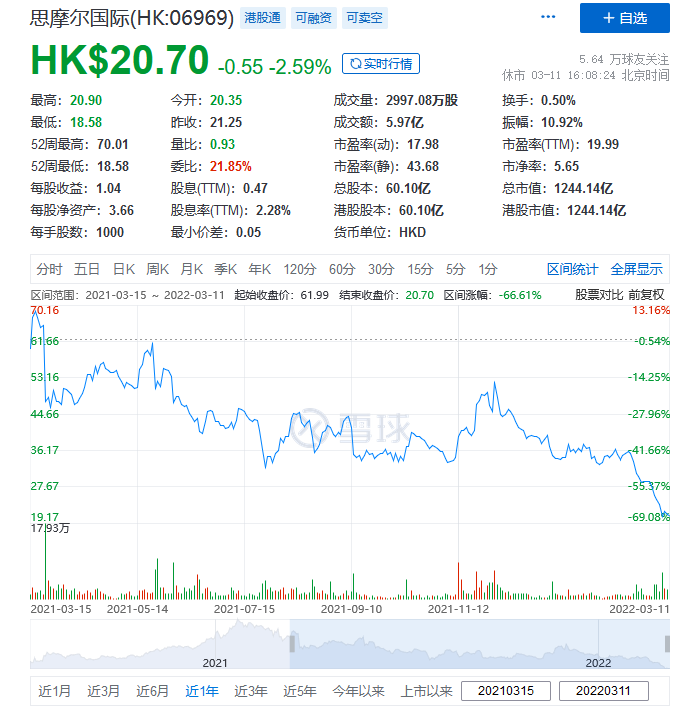 3月3日-11日,全球雾化设备代工龙头思摩尔国际大跌26.2%,市值蒸发442亿港元。一年内跌幅也高达66.61%。