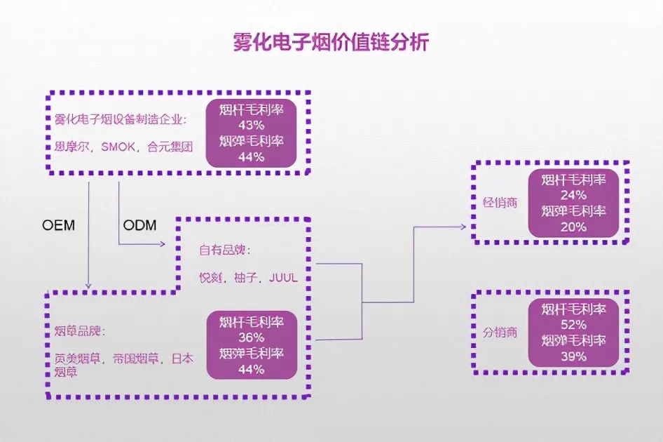 一般而言,电子烟行业代工厂生产烟杆的毛利率为43%,生产烟弹的毛利率为44%。而品牌商销售烟杆的毛利率为36%,销售烟弹的毛利率为44%。
