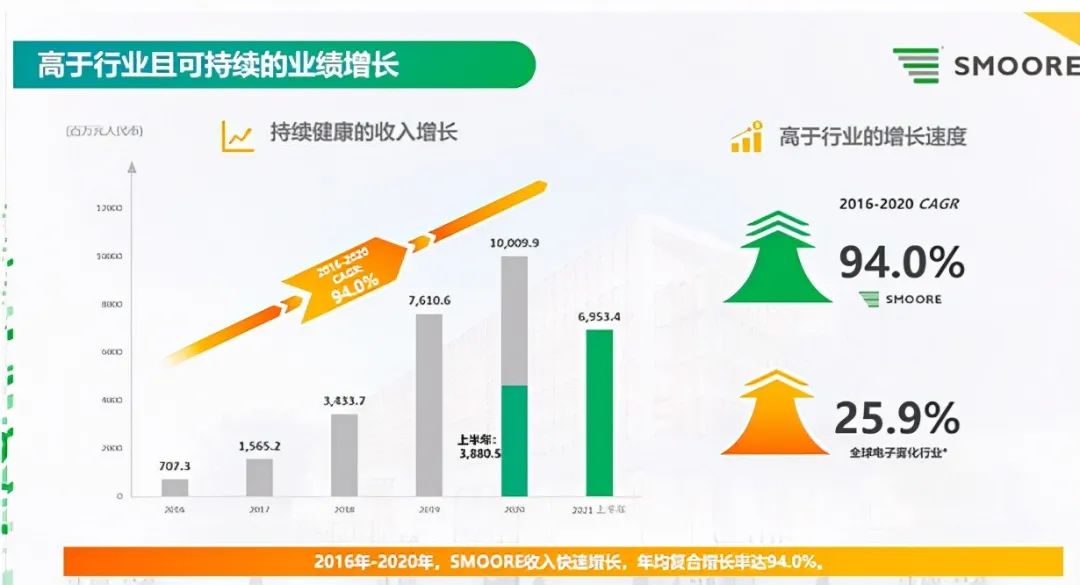 譬如思摩尔国际,数据显示2018年至2021年上半年,营收分别为34.37亿元、76.1亿元、100.09亿元、69.5 亿元,毛利率分别为34.7%、44%、52.9%、54.9%。