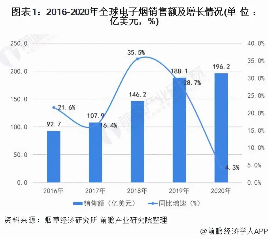 2016-2020年全球电子烟销售额,从92.7亿美元增长到196.2亿美元,近五年复合增长率超过20%.