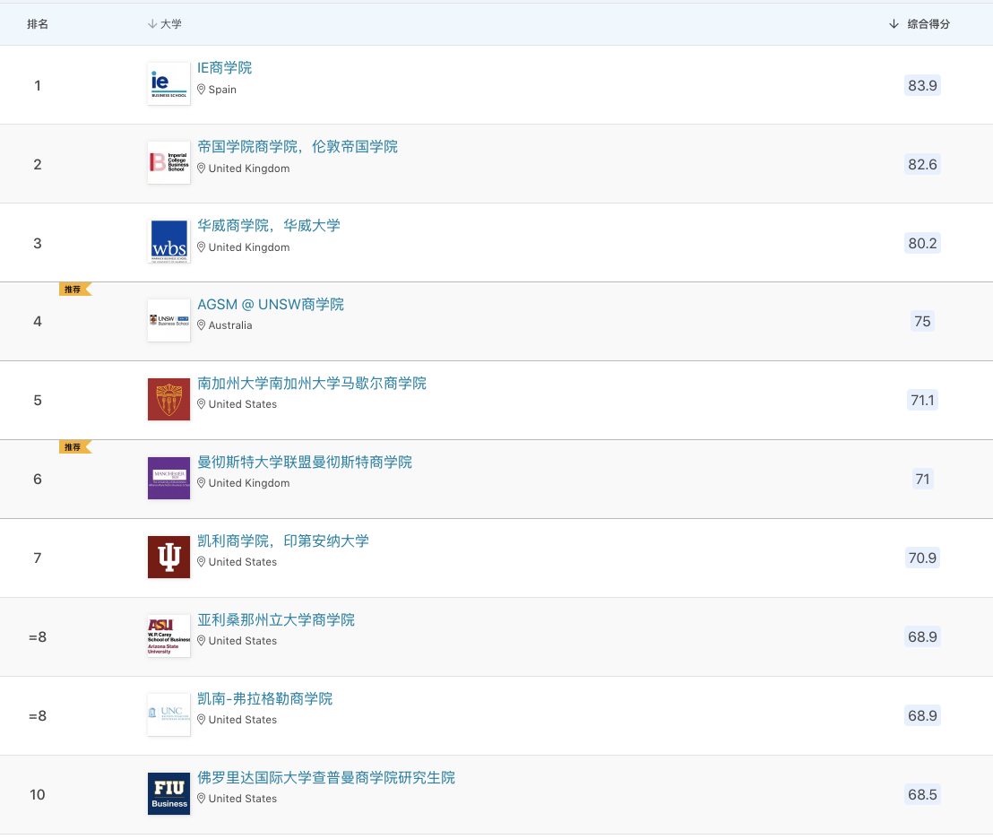 英国帝国理工商学院、华威大学商学院蝉联榜单第二和第三名。