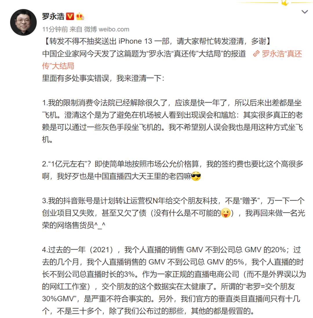 3月21日下午,老罗先是一口气连转了9条微博,批量否定了各大行业媒体关于他"即将还清债务"的报道,十多分钟后又发布了一个“合订本”,详细解释了限制消费令、签约费、抖音账号转让运营权、未来的计划创业方向等各大报道中常见的关键词,并表示倘若未来真到债务还完时,必将第一时间官宣。