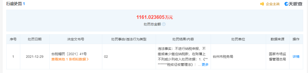 国家企业信用信息公示系统网站显示,古茗奶茶关联公司浙江古茗科技有限公司被台州市税务局罚款1161万余元。