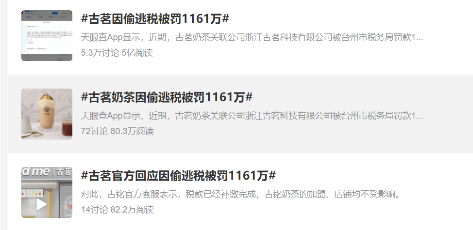 截至目前,#古茗因偷逃税被罚1161万#的相关话题在微博上达到5亿+的阅读量,引发数万人加入大讨论。