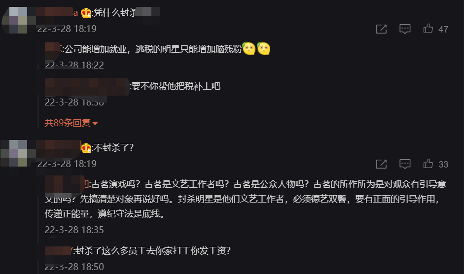 有意思的是,在话题评论中,还出现几波明星粉丝。当下,明星因偷逃税款被封杀的热度未褪,古茗恰好赶上这样的风口浪尖。某些明星“粉丝”认为,古茗没有被封杀,又凭什么封杀明星?这样的“无脑”争议,这无疑为古茗该事件的热度又添了一把猛火。