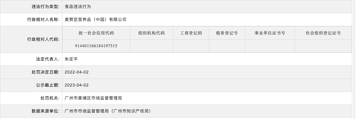 信用广州网站显示,4月2日,美赞臣营养品(中国)有限公司因食品违法行为被广州市黄埔区市场监督管理局罚款129.44万,没收金额60.289万。处罚事由显示,当事人进口总经销的铂睿婴儿配方奶粉(0-6月龄,1段)抽检时乙基香兰素超标,复检依然不合格,当事人收到检验报告后已开展召回工作。