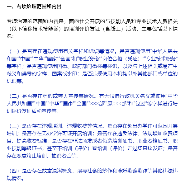 由此人社部将开展技术技能类“山寨证书”专项治理工作。具体治理范围和内容包括:违规使用有关字样和标识;虚假或夸大宣传;违规培训、违规收费,伪造培训证书,不培训直接发证;故意混淆概念、误导社会的炒作和涉嫌欺骗欺诈等其他违法违规情况。