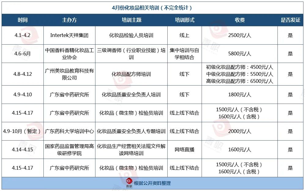 在这样的背景下,培训市场迎来了火爆的局面。青眼曾有关注过,去年3月到6月份,化妆品行业相关培训多达近20场,相当密集。青眼最新调查发现,近期6家单位发布了化妆品配方师、化妆品检验人员等培训招生信息,仅本月就有8场培训,化妆品相关培训依然如火如荼。