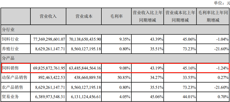 在上述背景下,海大集团的饲料销售业务景气度较高,全年实现营收698.26亿元,同比增长43.19%。不过该业务毛利率却同比下滑1.24%至9.08%。