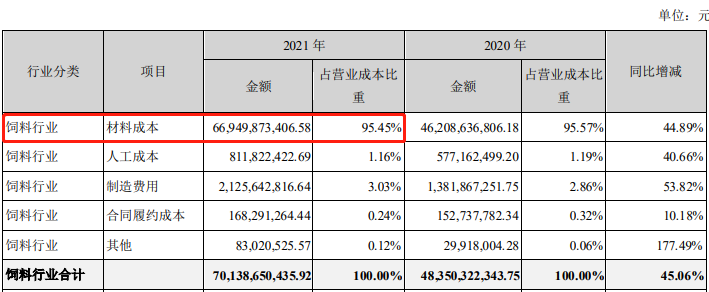海大集团饲料业务主要原材料为玉米、豆粕等,该业务材料成本常年占总成本的95%以上。大宗农产品的价格直接影响了公司的营业成本。